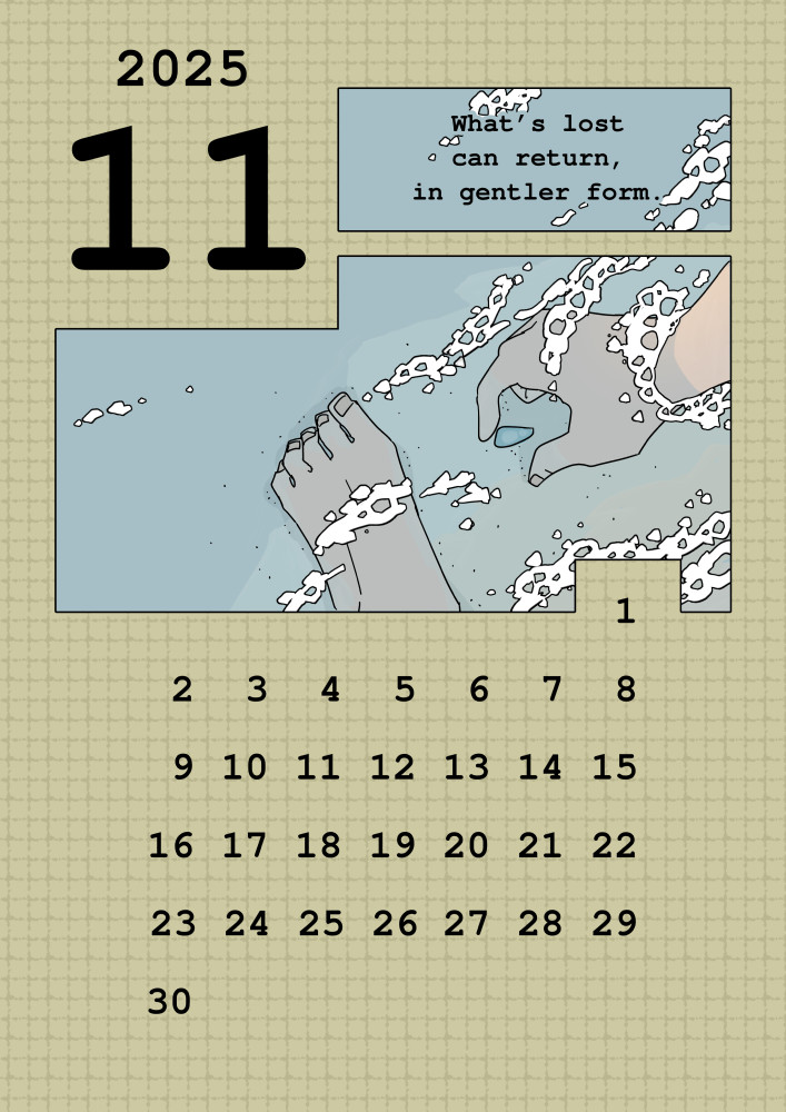 暗めの絵なので、背景色にかなり悩みました。白は9月カレンダーと似ちゃうし、秋とコスモスっぽくくすんだピンクにしたらなんかしっくりこないし。色ってムズ~。