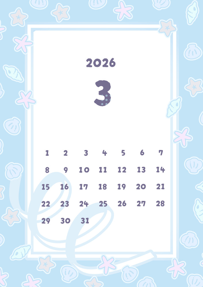 2月カレンダーが全く2月らしくなかったので、3月はかわいいやつを目指しました。相変わらず季節感はややありませんが、3月と言えば水色なので(要出典)これです。いい感じにかわいいのではないのでしょうか。